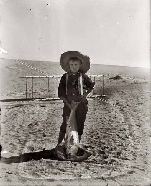 "Tom Tate, the son of Captain Tate's half-brother Daniel Tate, poses with a drum fish in front of a 1900 Wright glider"
